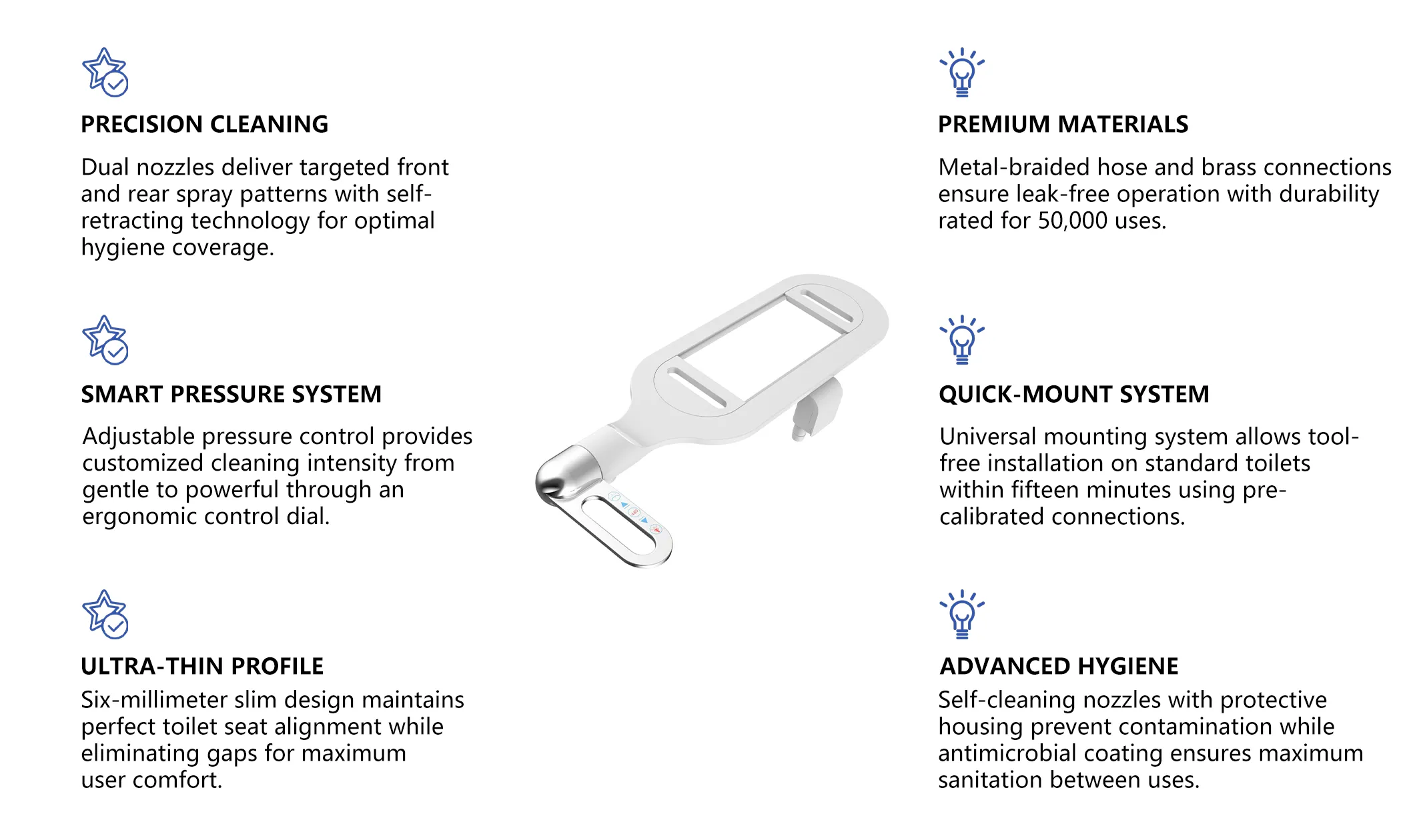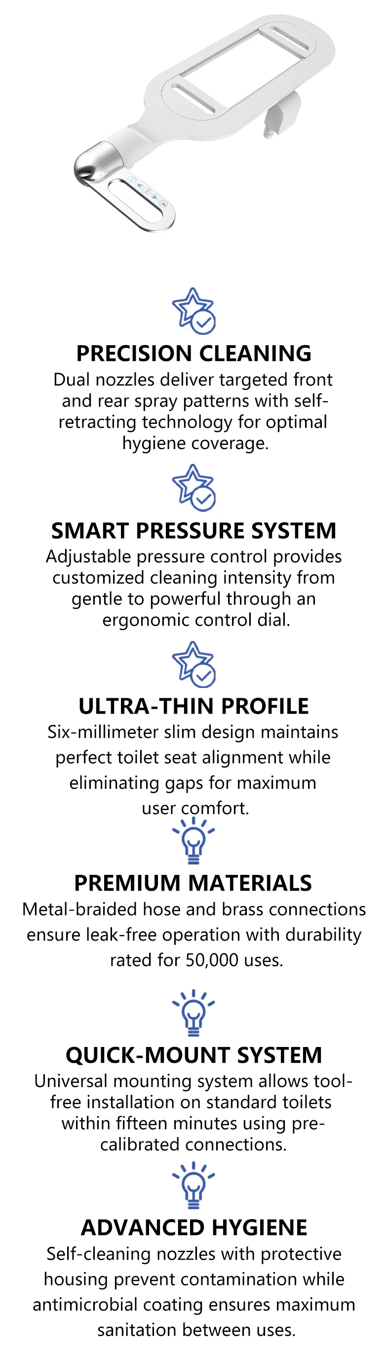 - Dual-nozzle design offers separate rear and feminine wash modes, giving every family member a cleaner and more comfortable experience.